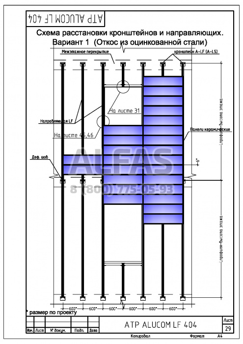 Alucom LF 404 – алюминиевая подоблицовочная конструкция, с креплением только в межэтажные перекрытия. Система разработана для зданий, на которых невозможно применение классической схемы крепления к несущим стенам, из-за низкой несущей способности стен (пенобетон, газосиликат, щелевой кирпич), а возможно лишь крепление в межэтажные железобетонные перекрытия.